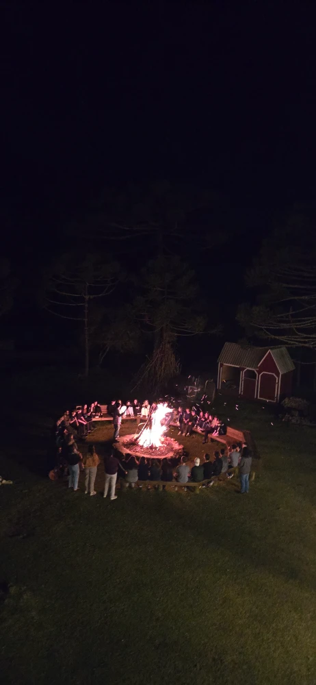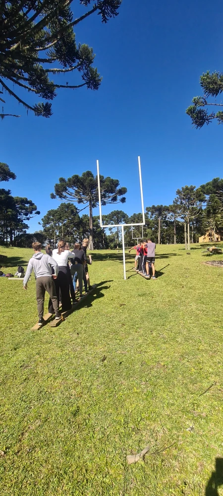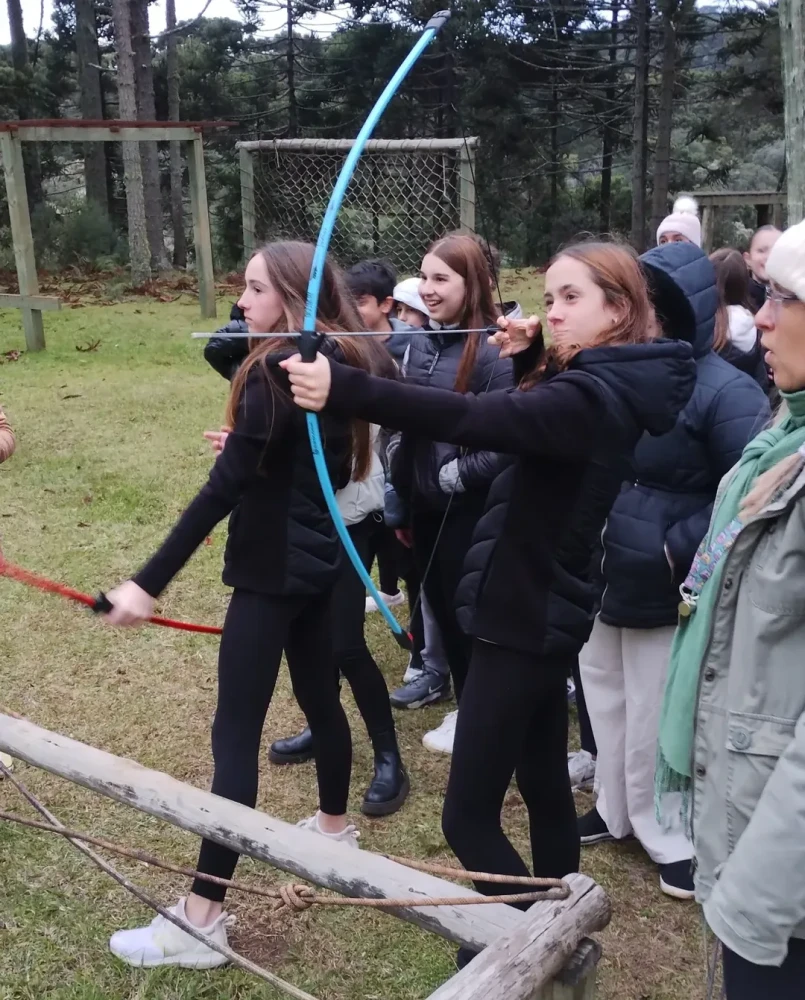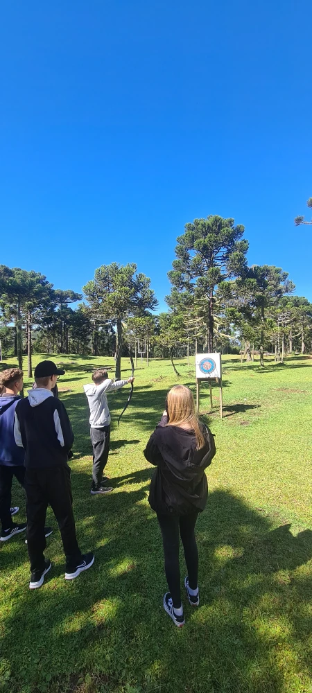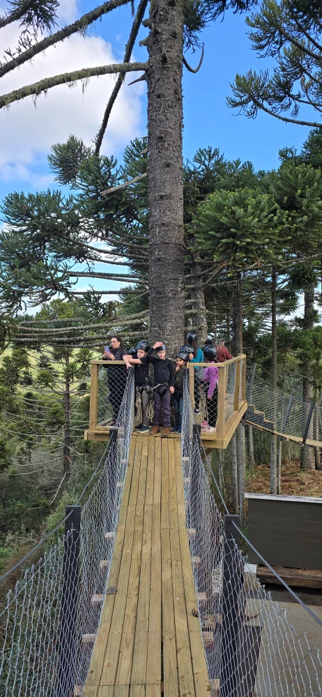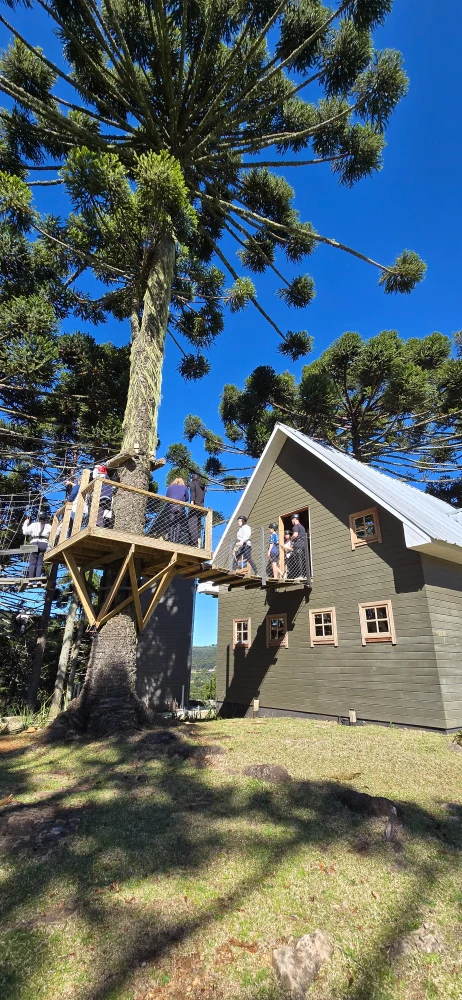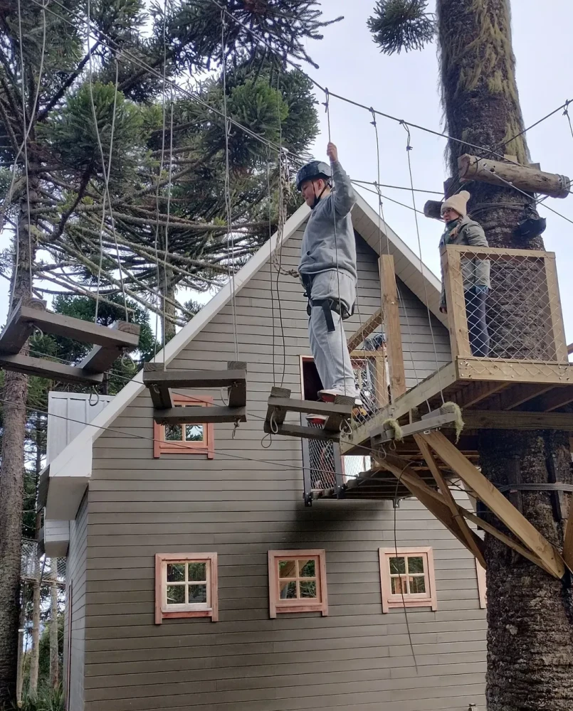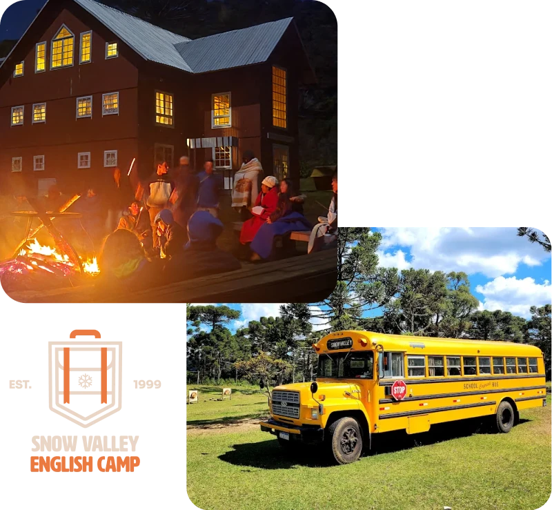 Tirolesa, arvorismo, trilha sensorial, jogos cooperativos, fogueira com prática do idioma.